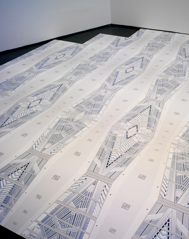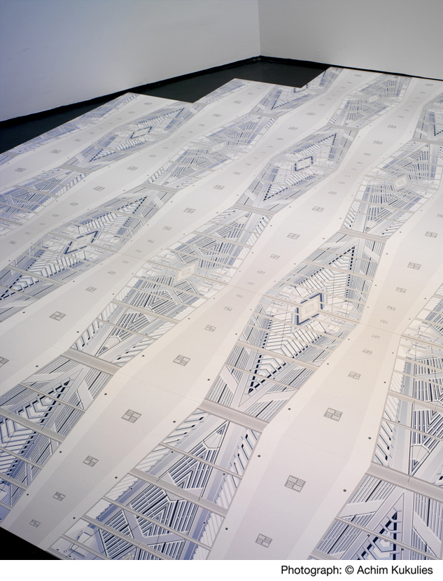 A computer drawing showing a central perspective view of the ceiling construction of the space was printed onto 50 x 50 cm Forex boards, which were laid together to form a floor ornament.