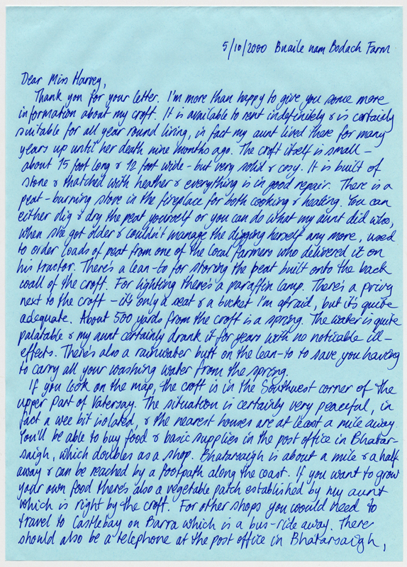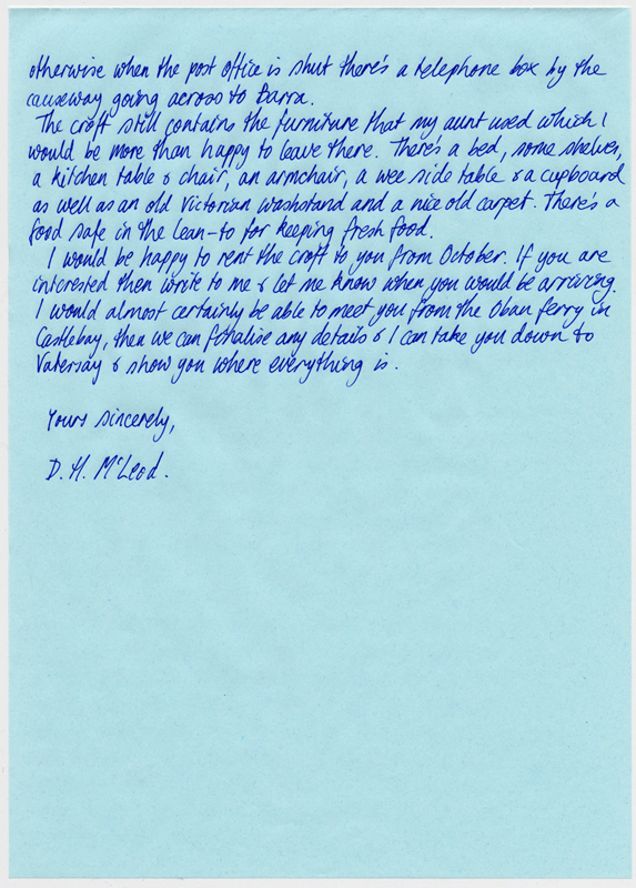 I'm actually writing to you to ask you if you could possibly do a favour for me. You probably remember me talking to you about wanting to live in the Outer Hebrides and now I'm finally moving there. I applied for a residency from the Scottish Arts Council and I just heard today that I got it so I've got money for three years which is great.