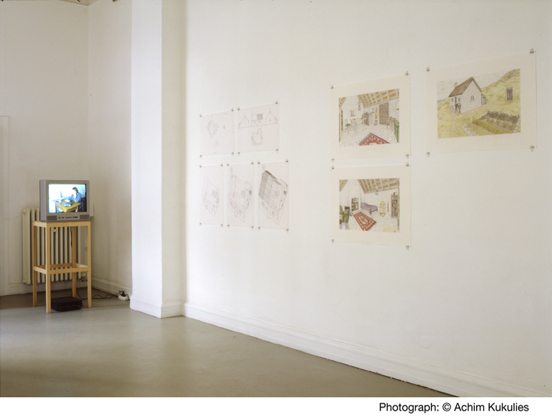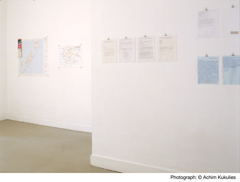 Coloured pencil on paper, ink on tracing paper, A4 printed texts, coloured pencil on maps, video: 40 mins, 2000