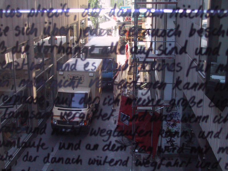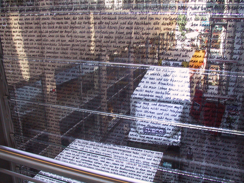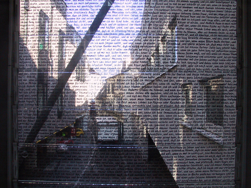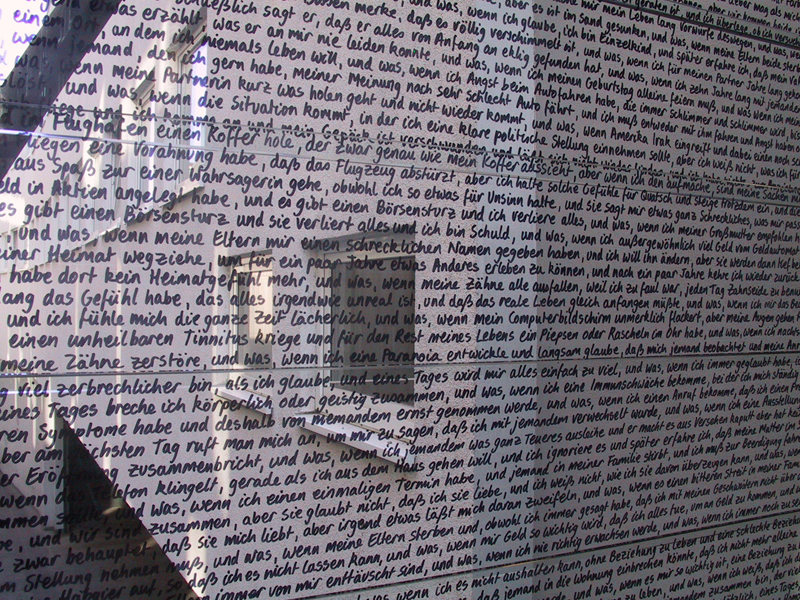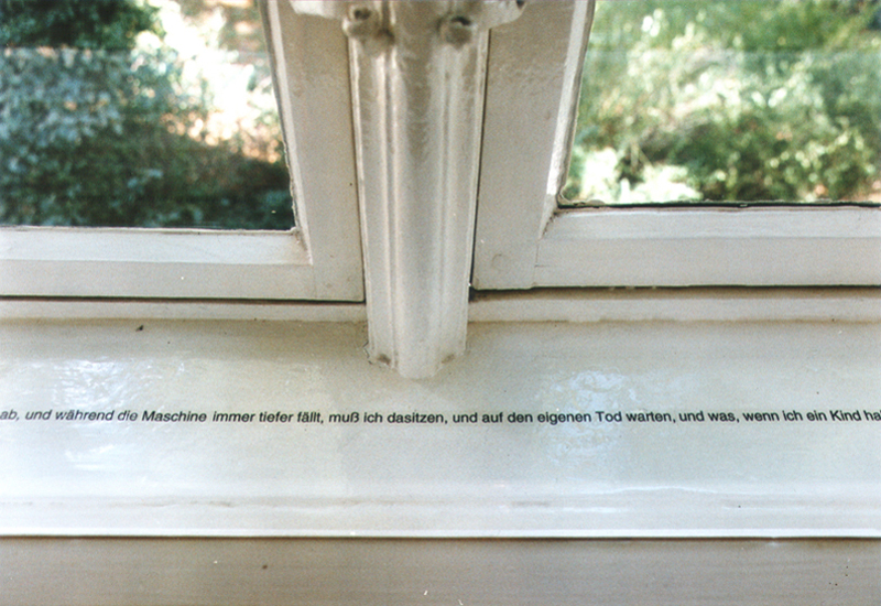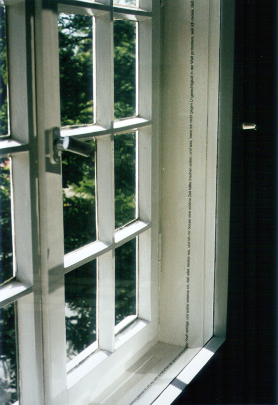 Worry was installed in all 27 windows of the Kunstverein. The text was printed onto strips of self-adhesive transparent film and attached as a continual text loop on all four sides of the space between the double windows. The work only became visible when the visitor looked through the window. The text had no beginning or end. A different part of the endless worry ran through each window.